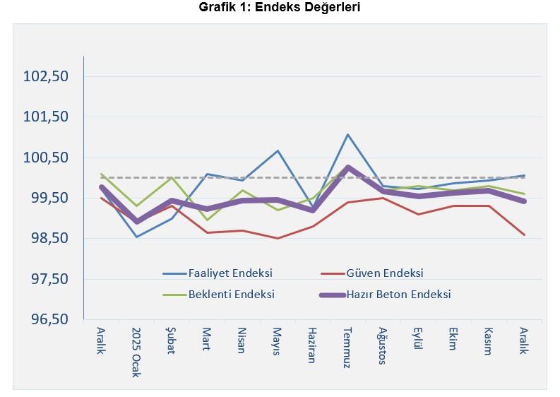 Aralık 2025’te Faaliyet Endeksi, geçen yılın aynı ayına göre %0,3 arttı ve sektör faaliyetlerinde sınırlı toparlanma sinyali verdi. Ancak Güven Endeksi %0,9 düşerek en olumsuz performansa imza attı. Beklenti Endeksi %0,5 azalışla temkinli görünümü korudu. Hazır Beton Endeksi genel olarak %0,4 gerileyerek sektörde zayıf bir görüntü çizdi.
